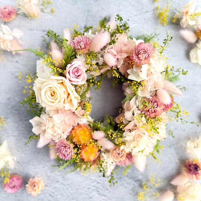 やさしい春色の花々を丁寧に紡いだ、上品なフラワーリースです。 淡いピンクやクリームカラーが、落ち着きのある華やかさを演出します。 卒業・入学、送別やお祝いなど、セレモニーシーズンのギフトにぴったりです。 卒業・離任など、先生への感謝の気持ちを伝える贈り物としてもおすすめ。 派手すぎず、控えめながらも心に残るデザインで、職員室やご自宅にも自然になじみます。 プリザーブドフラワーを使用しており、お手入れ不要で長くお楽しみいただけます。 「ありがとう」「おめでとう」の想いを、そっと形にした春のリースです。 お支払い完了から7日以内に発送致します。 直径約24cm ●なるべく近いお色で撮影しておりますが、ご利用端末によって実際の商品と 見え方が異なる場合がございます。 ●丁寧にお作りしておりますが、ハンドメイド品のため個体差が出る場合がございます。 ●プリザーブドフラワーは繊細にできておりますので、お取り扱いには充分ご注意ください。 直射日光や高温多湿の場所はお避け下さい。 褪色や染料が滲み出る場合がございます。 ●配送中に多少の花落ちがある場合がございます。 それも考慮した上でお作りしております。