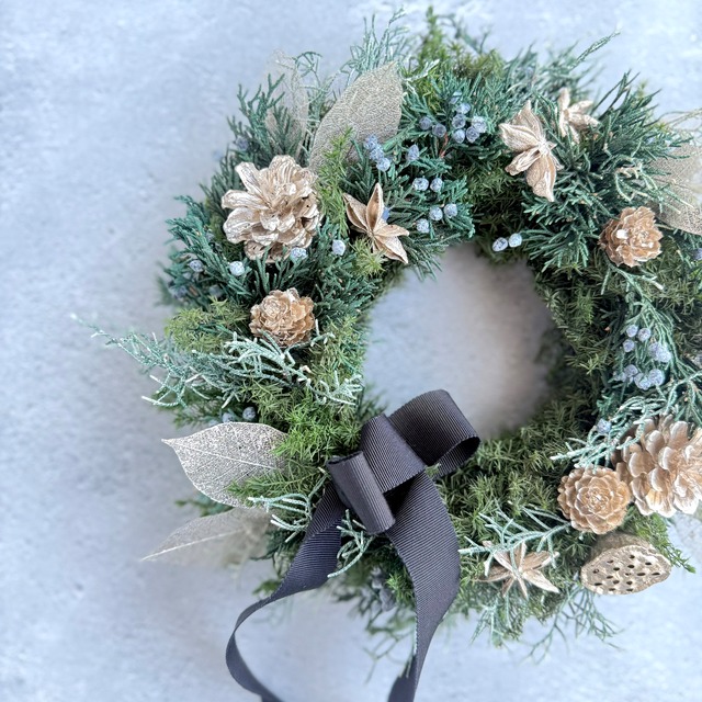 たっぷりの針葉樹にプラチナゴールドカラーの木の実で飾り付けしました。 スケルトンリーフを入れて少し抜け感を出しました。 ブラックのグログランリボンをアクセントにシックに仕上げました。 品の良いプラチナゴールドで、落ち着いた雰囲気の大人のリースです。 インテリアに馴染みやすく、飾りやすいサイズ感です。 プリザーブドフラワーなので長くお楽しみいただけます。 サイズ 直径約25cm お支払い完了から3日以内に発送致します。 ●なるべく近いお色で撮影しておりますが、ご利用端末によって実際の商品と 見え方が異なる場合がございます。 ●丁寧にお作りしておりますが、ハンドメイド品のため個体差が出る場合がございます。 ●プリザーブドフラワーは繊細にできておりますので、お取り扱いには充分ご注意ください。 直射日光や高温多湿の場所はお避け下さい。 褪色や染料が滲み出る場合がございます。 ●配送中に多少の花落ちがある場合がございます。 それも考慮した上でお作りしております。