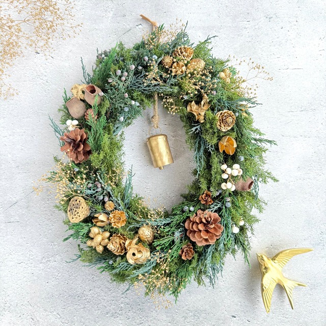 森を感じさせる様々な針葉樹をたっぷりと使用したオーバル型のリースです。 ゴールドの木の実とかすみ草で飾り付け。 揺れるとカランコロンと柔らかな音色のカウベルがおしゃれなアクセントです。 オーバル型で少しだけ個性的に飾りたい方へおすすめです。 プリザーブドフラワーなので枯れることなく長くお楽しみいただけます。 手に取るとほのかに針葉樹の香りがします。 飾る際は直射日光、雨を避けた場所でお願い致します。 水に濡れると色落ちする場合がございます。 サイズ 横幅約25cm 縦約34cm お支払い完了から3日以内に発送致します。 ●なるべく近いお色で撮影しておりますが、ご利用端末によって実際の商品と 見え方が異なる場合がございます。 ●丁寧にお作りしておりますが、ハンドメイド品のため個体差が出る場合がございます。 ●プリザーブドフラワーは繊細にできておりますので、お取り扱いには充分ご注意ください。 直射日光や高温多湿の場所はお避け下さい。 褪色や染料が滲み出る場合がございます。 ●配送中に多少の花落ちがある場合がございます。 それも考慮した上でお作りしております。