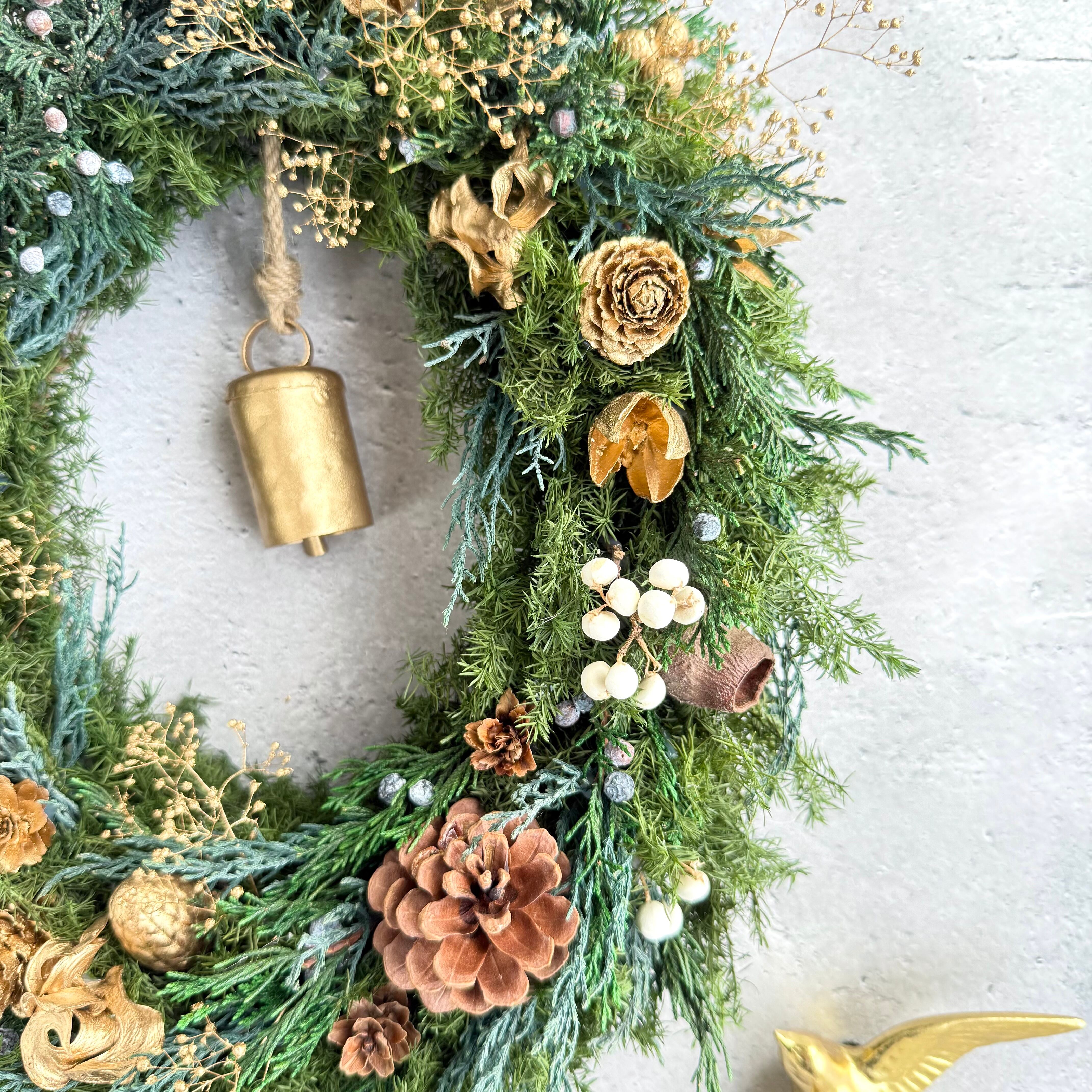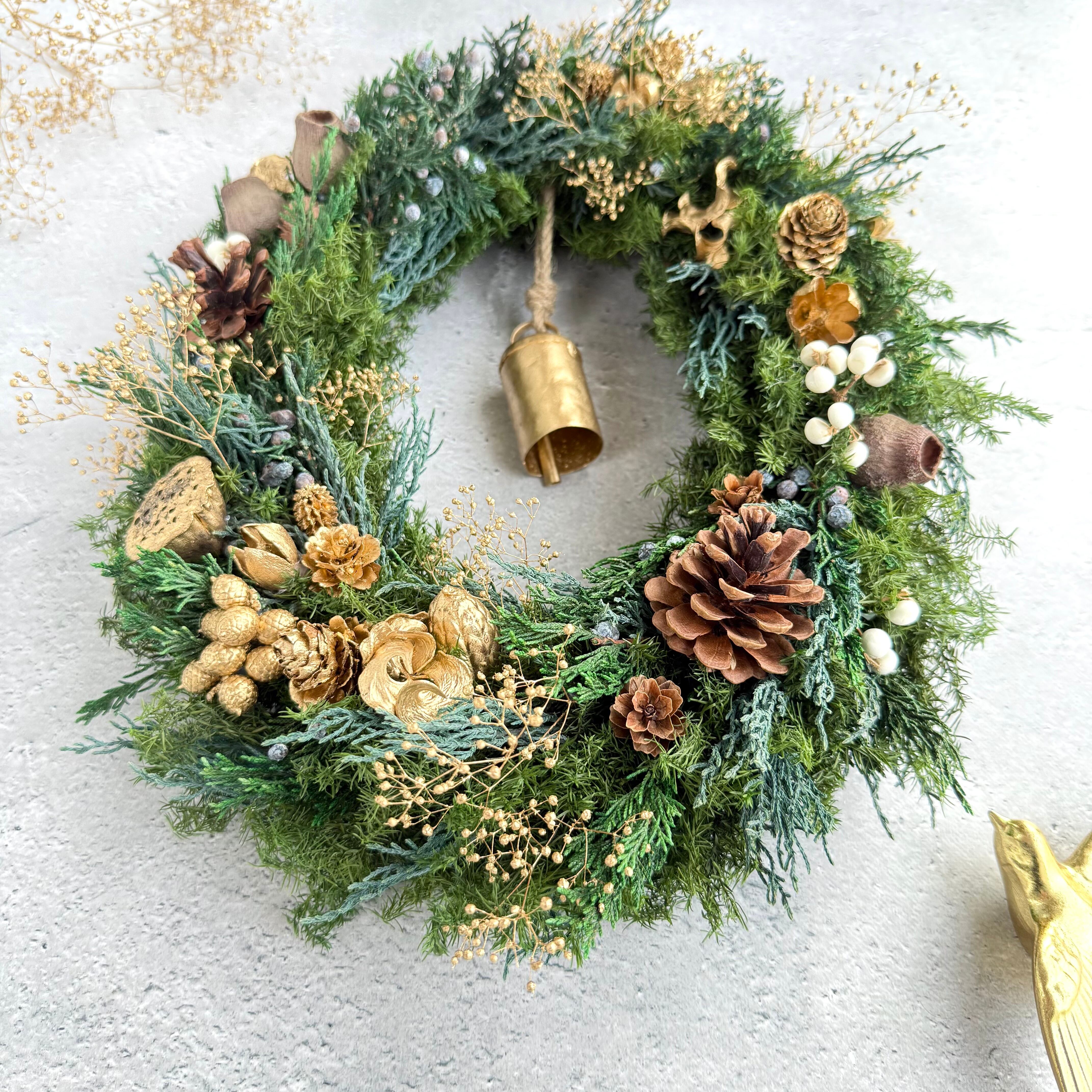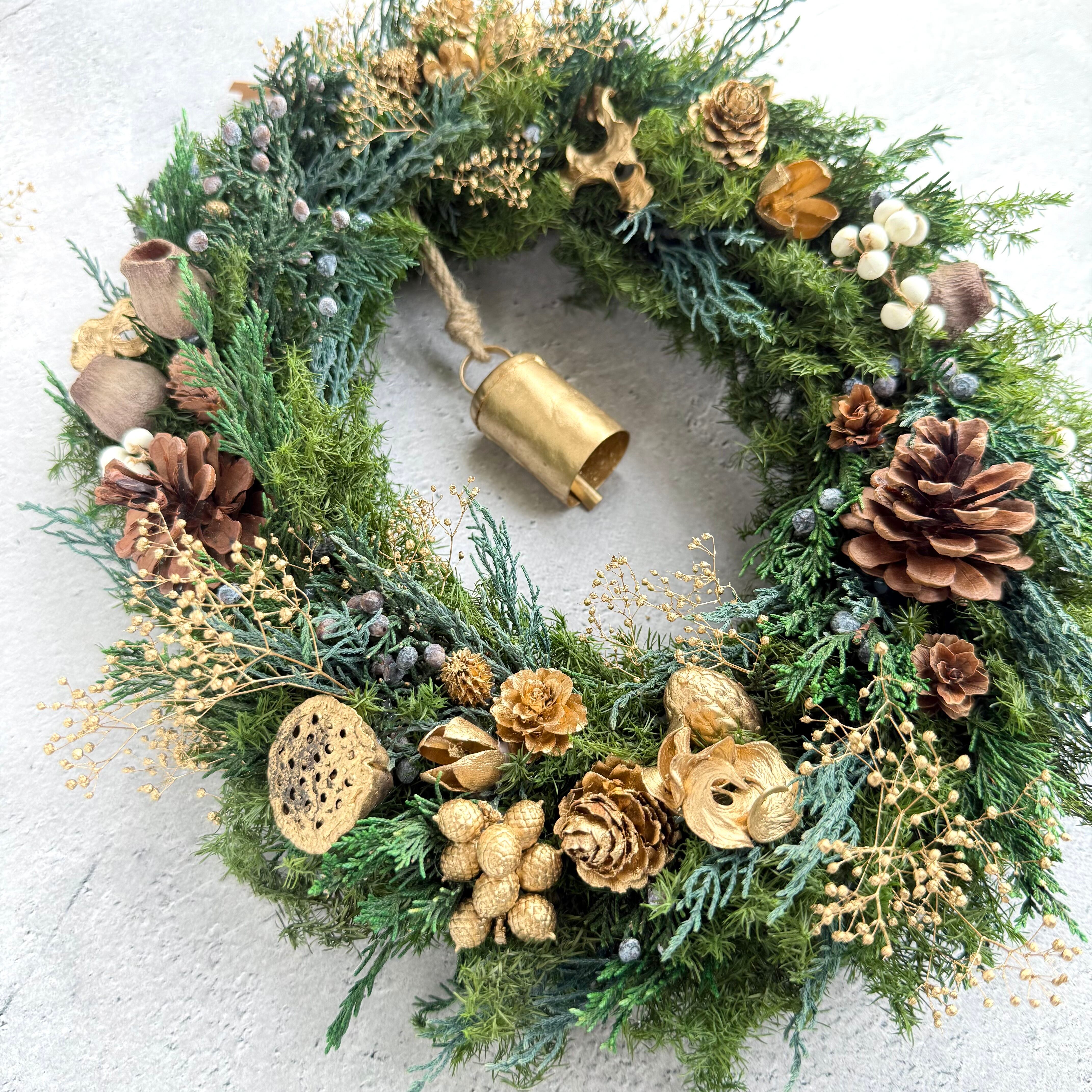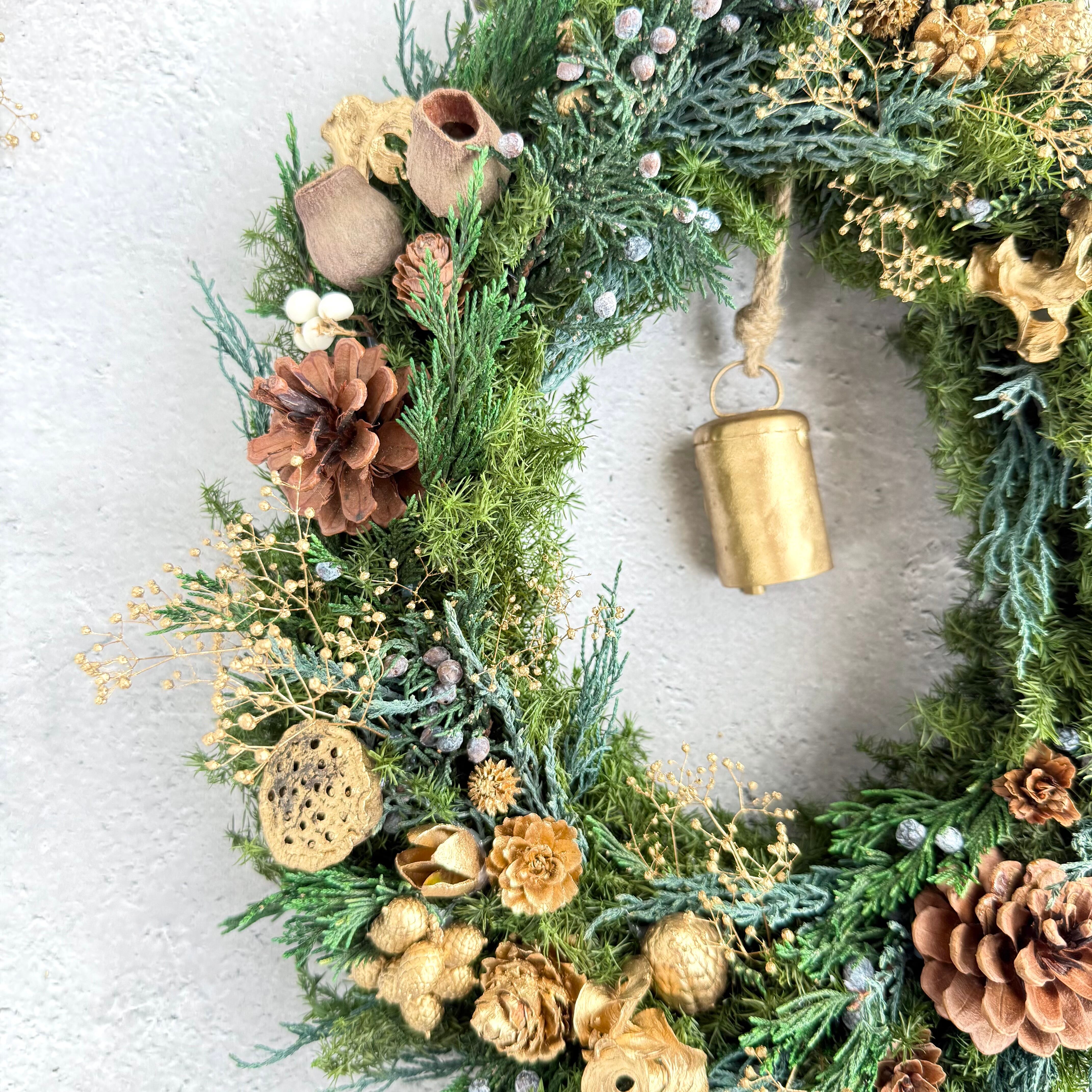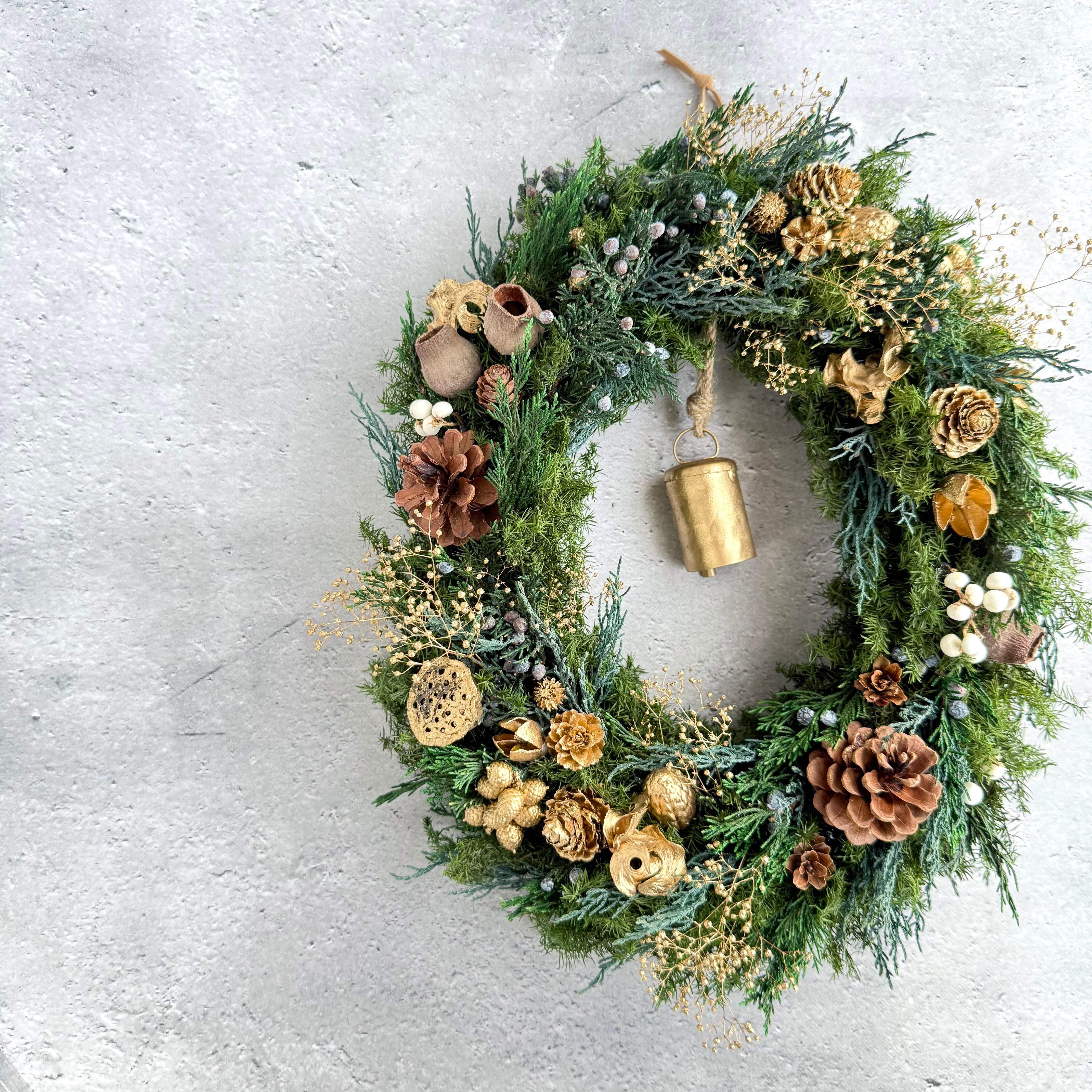 森を感じさせる様々な針葉樹をたっぷりと使用したオーバル型のリースです。