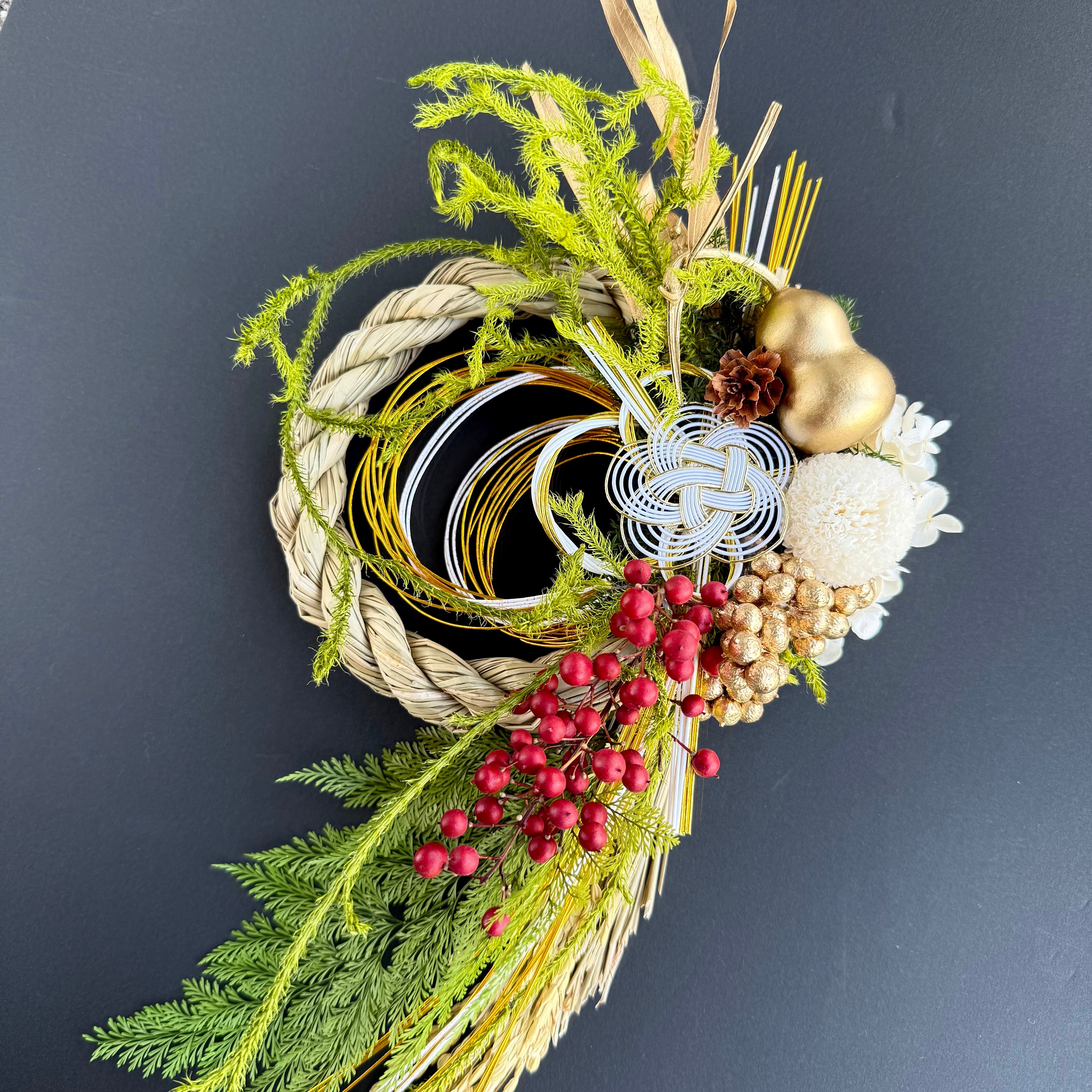 水引とお花、瓢箪、南天などで華やかに飾り付けしたしめ飾りです。