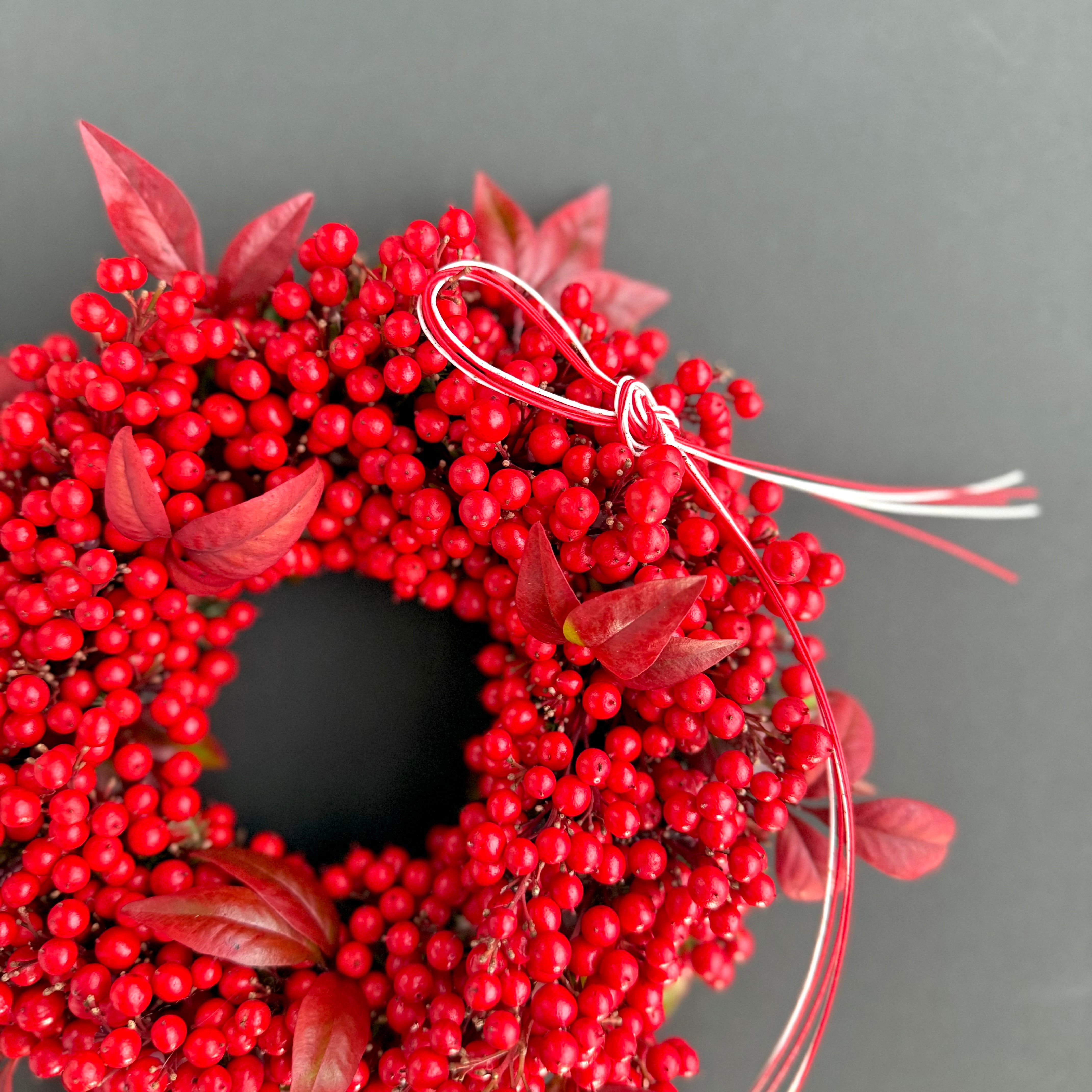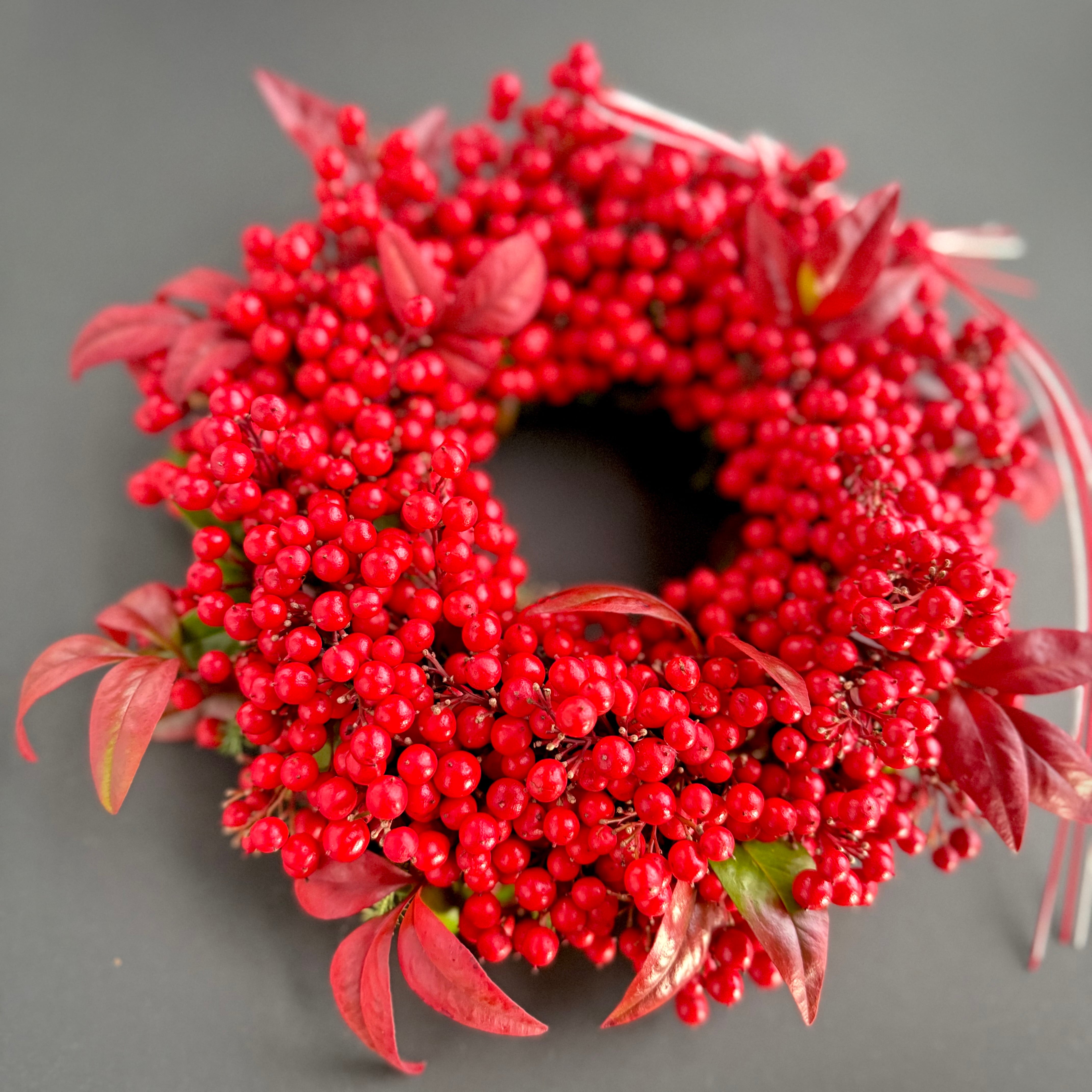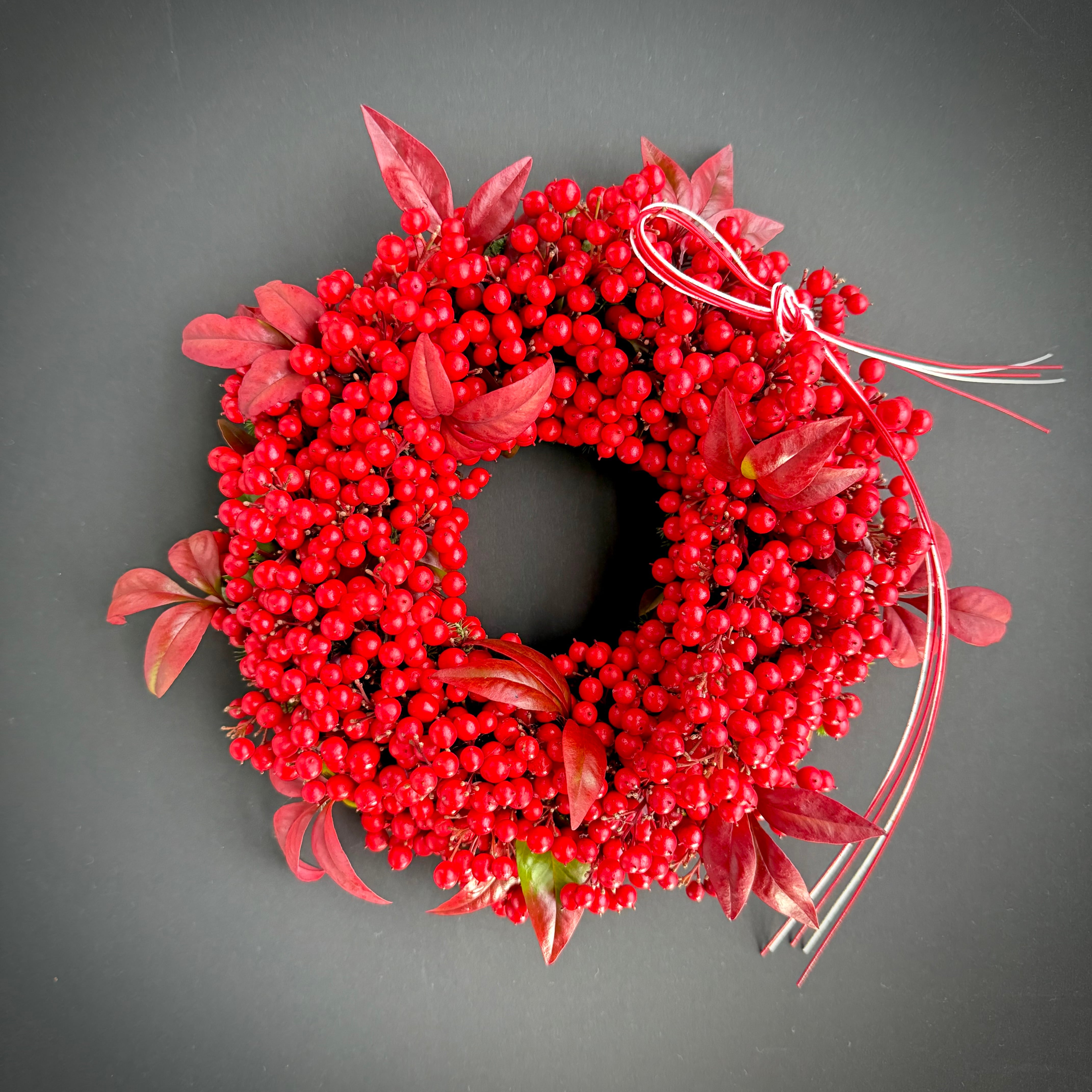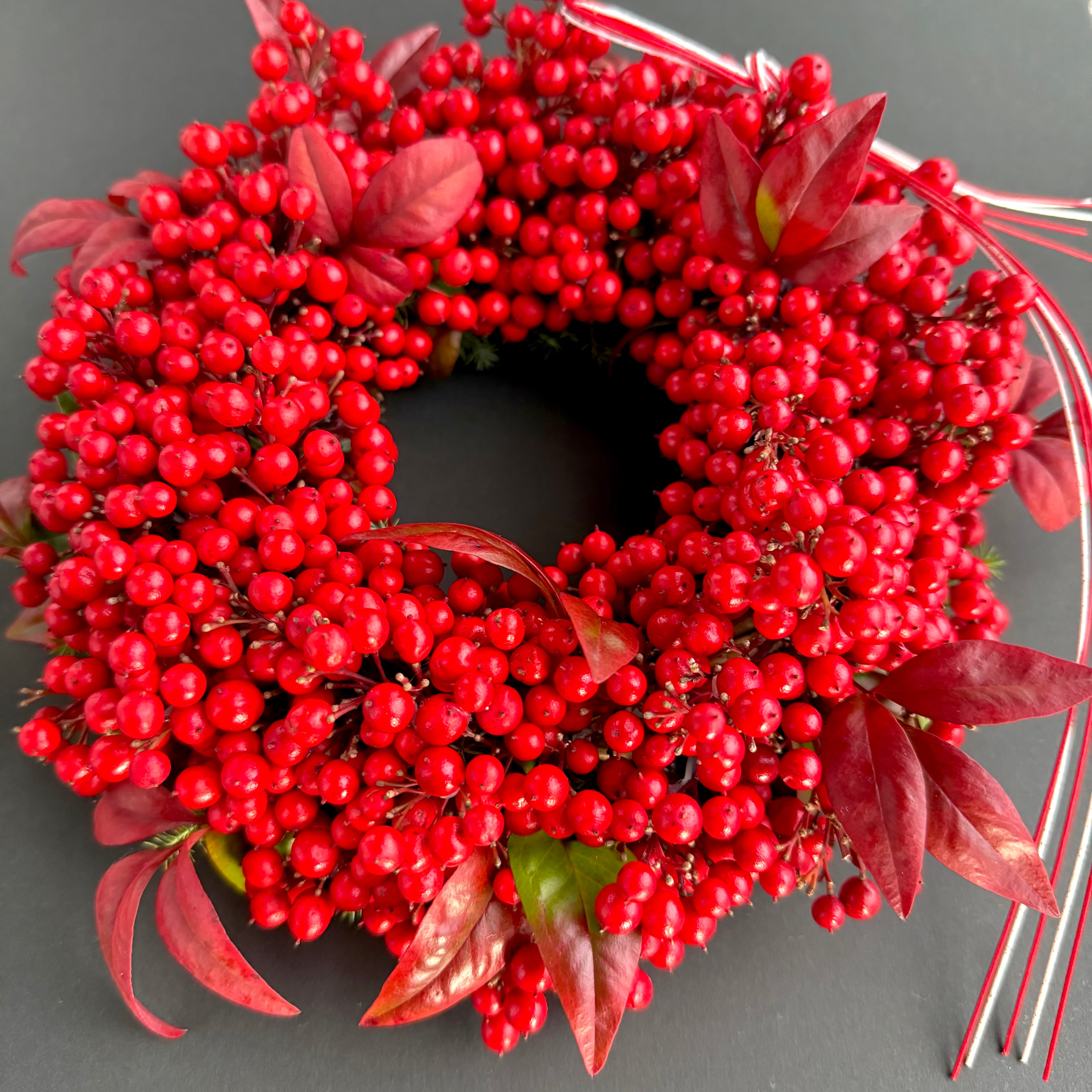 南天の実と紅葉した南天の葉でシンプルながらも目を惹くデザインに仕上げました。