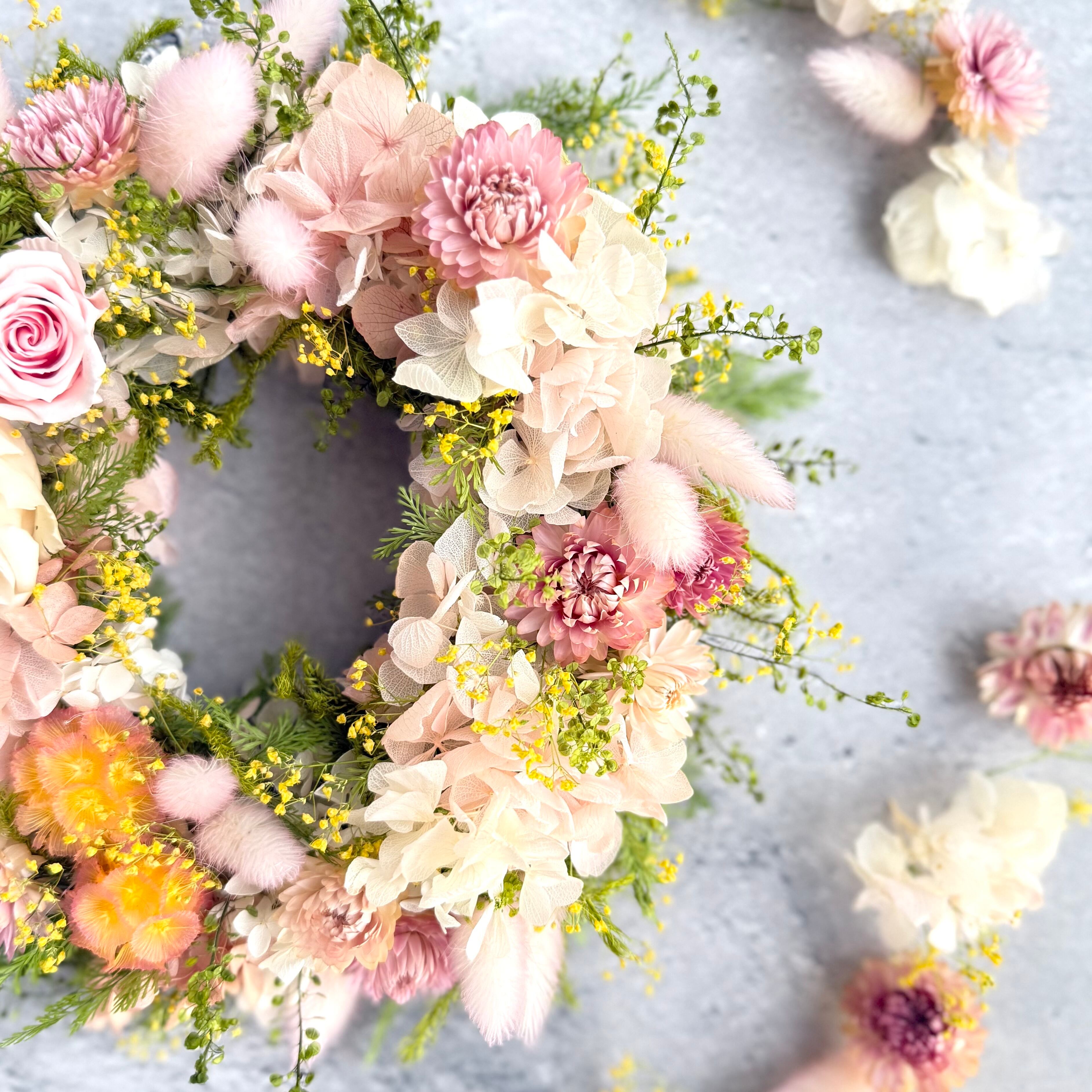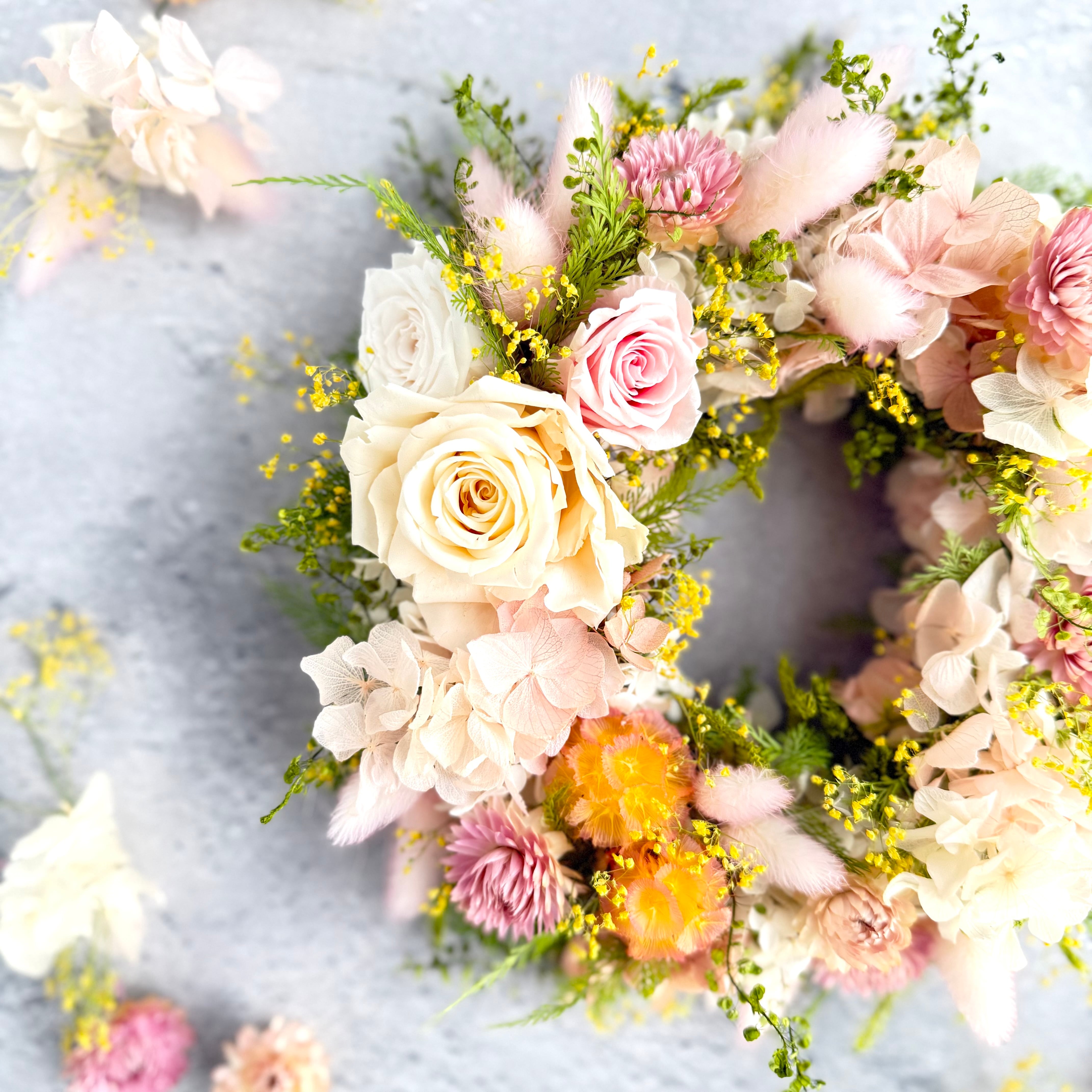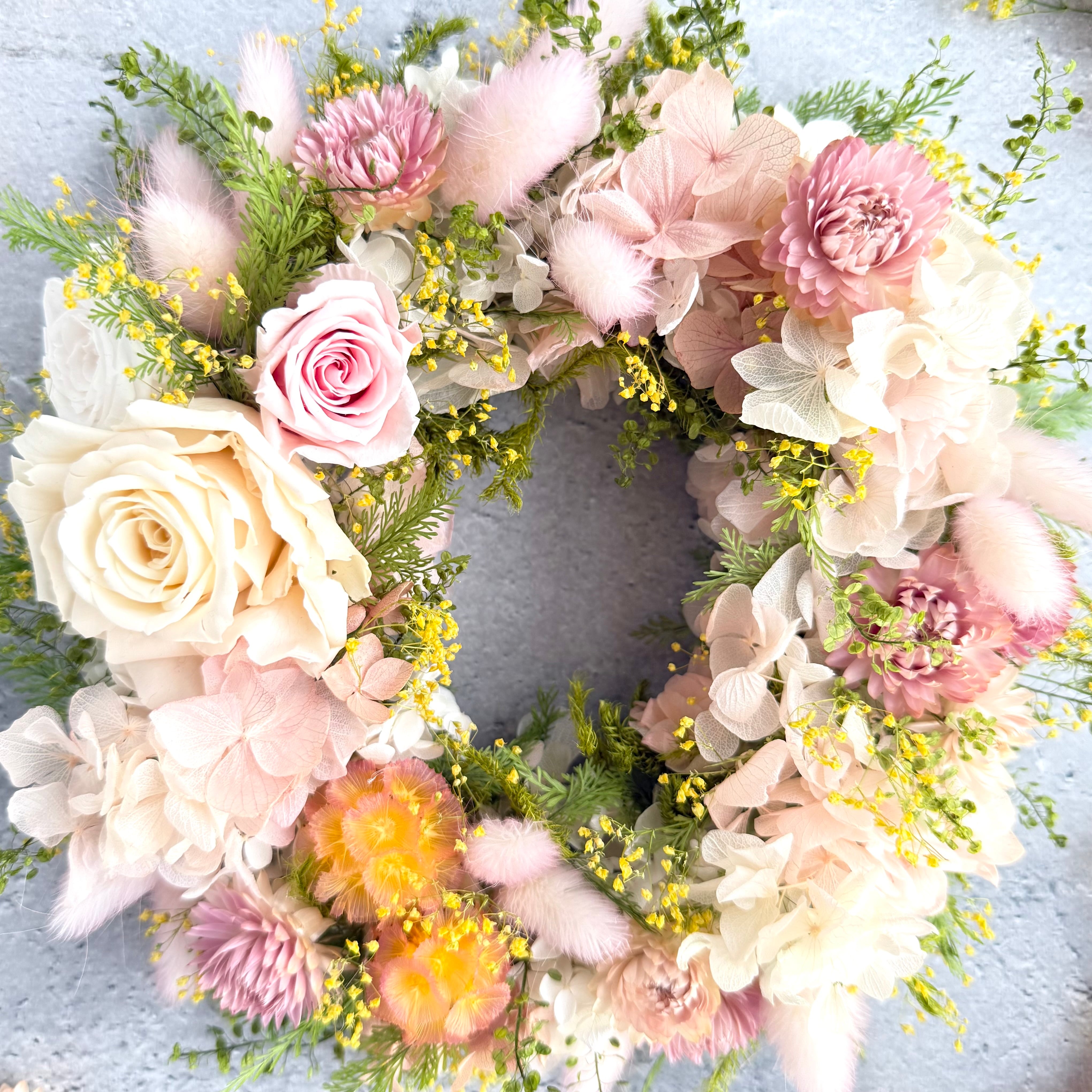 やさしい春色の花々を丁寧に紡いだ、上品なフラワーリースです。