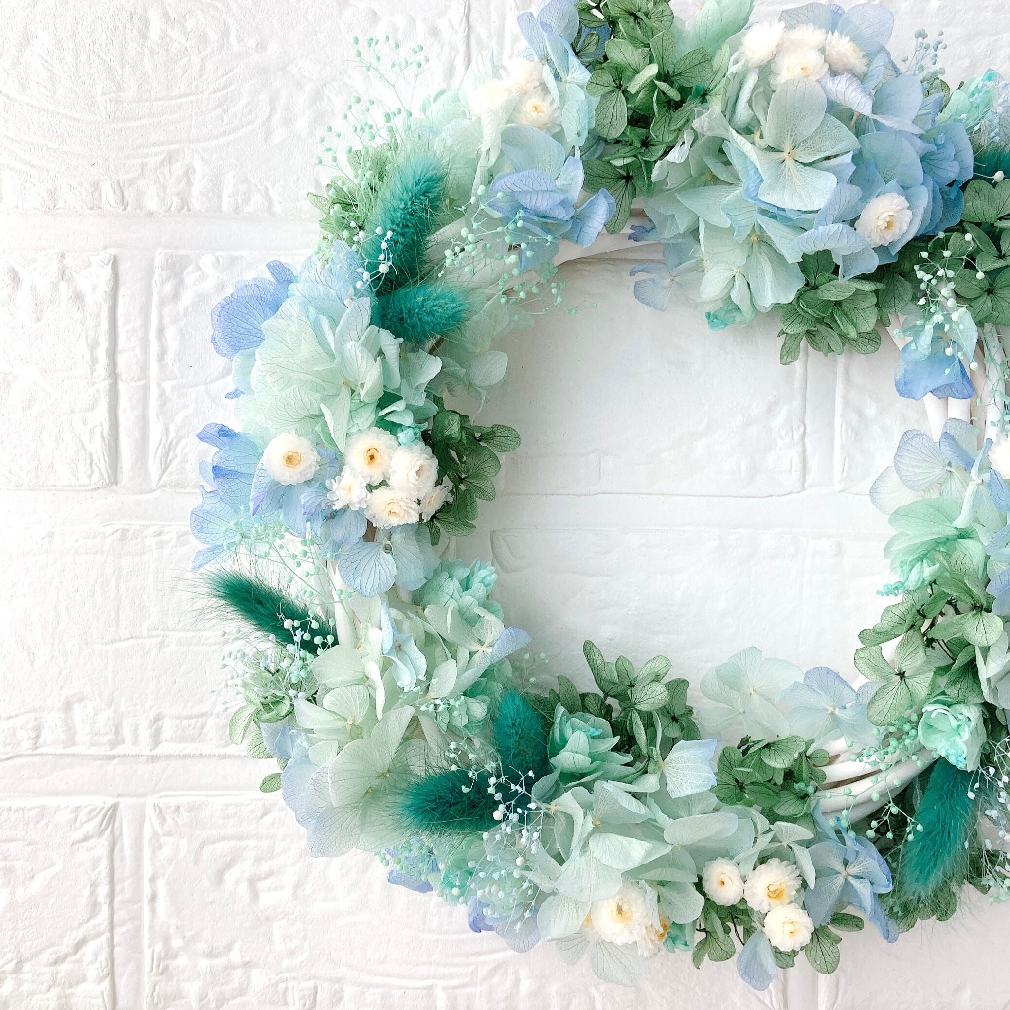 白いリースをベースに、ブルーミントグリーンのカラーのお花でまとめました。