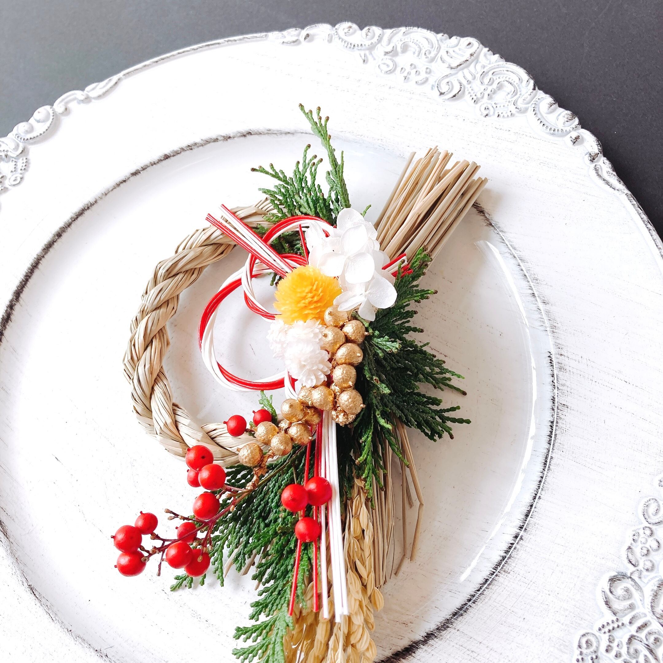 お正月の玄関を小さいながら華やかに彩るおしゃれなミニしめ縄リースです。