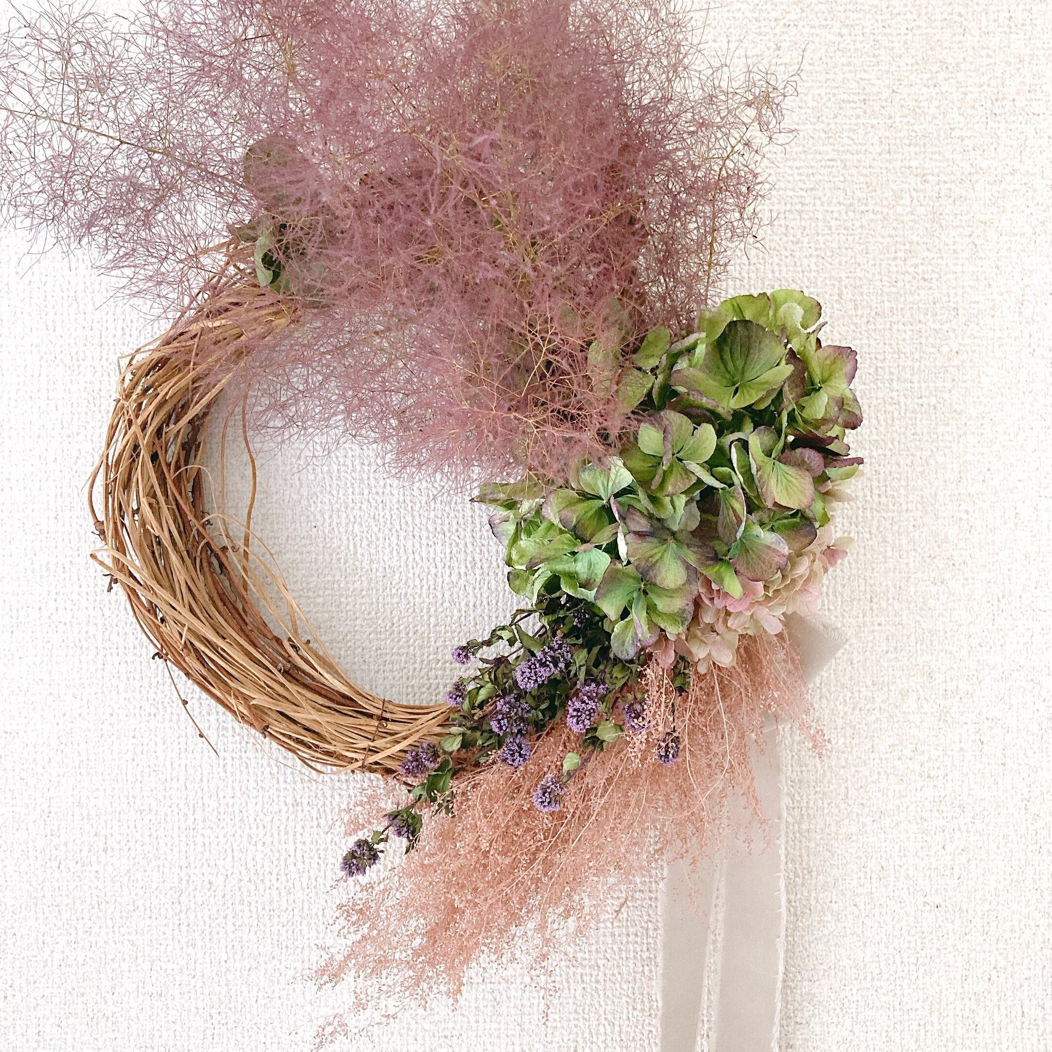 この季節限定のレッドのスモークツリーとあじさいのドライフラワーをメインに