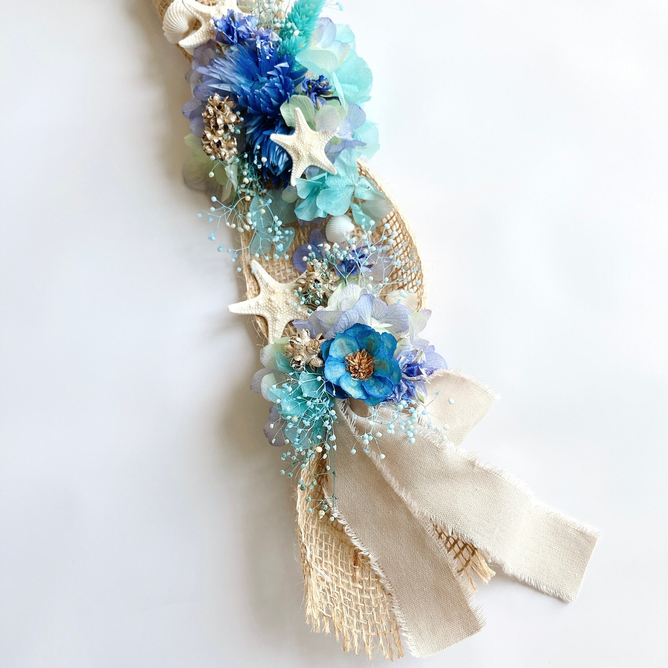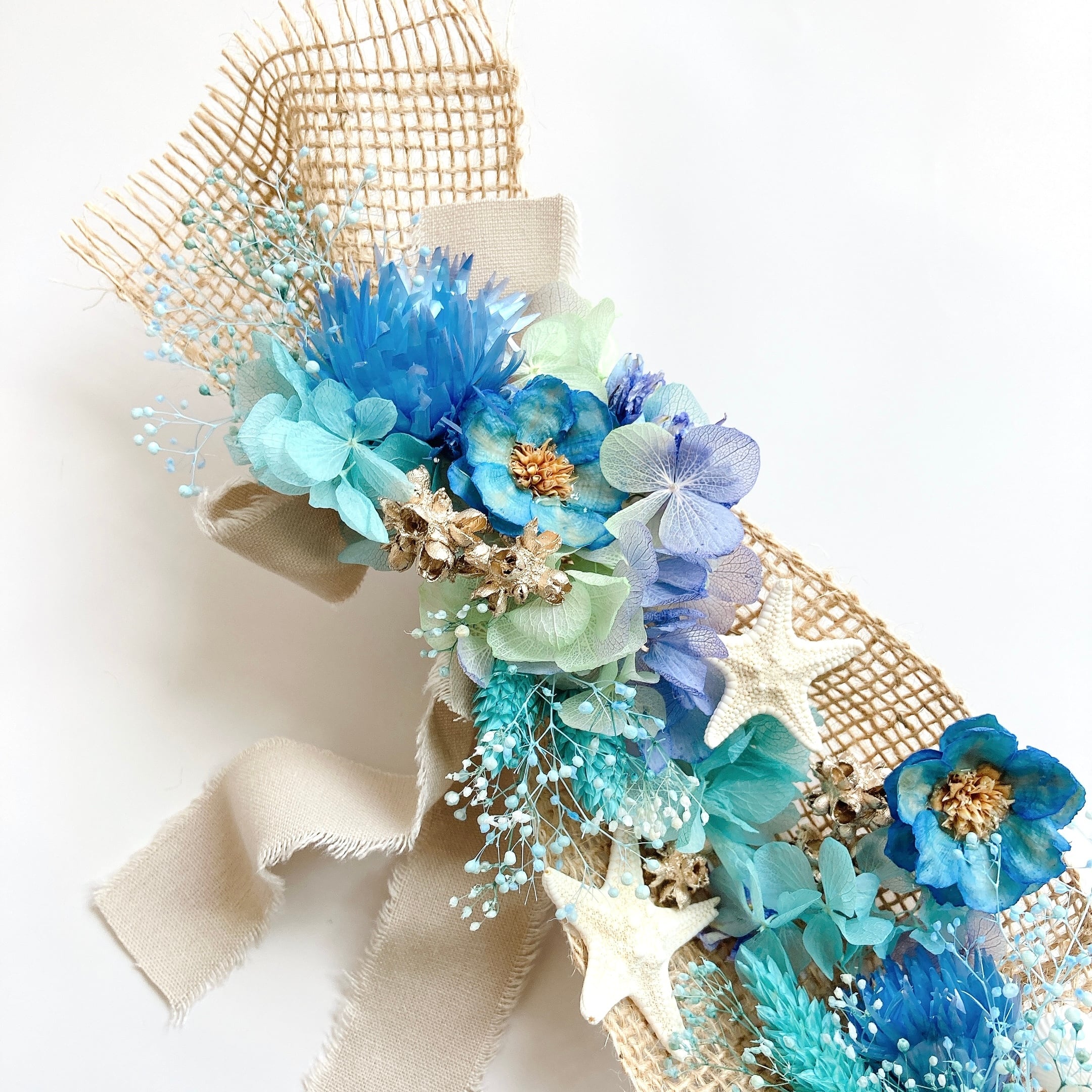 色々な表情を見せる海のように、様々な青を重ねて作ったフラワーガーランドです。