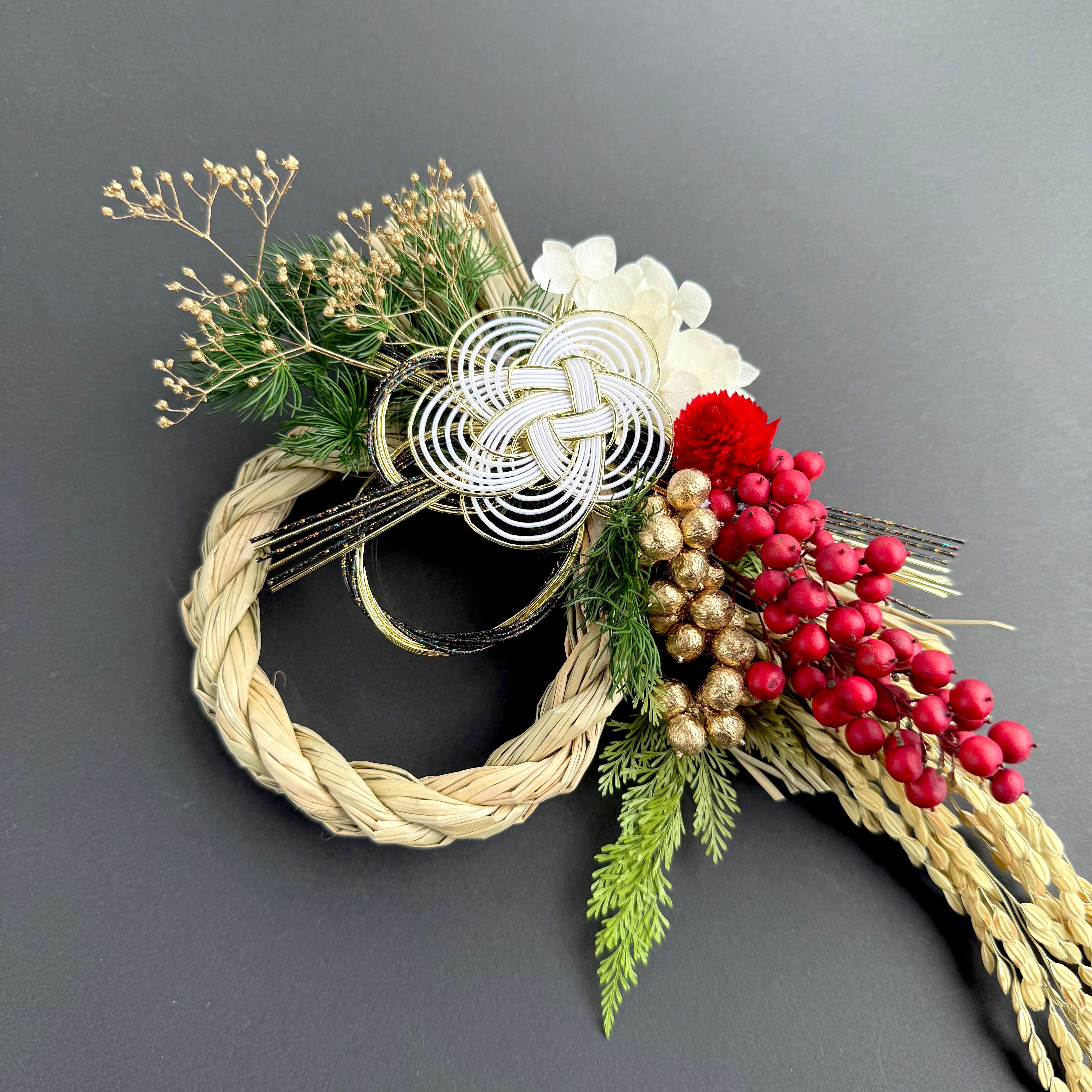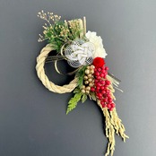 水引とお花で飾り付けした手のひらサイズのミニしめ縄リースです。